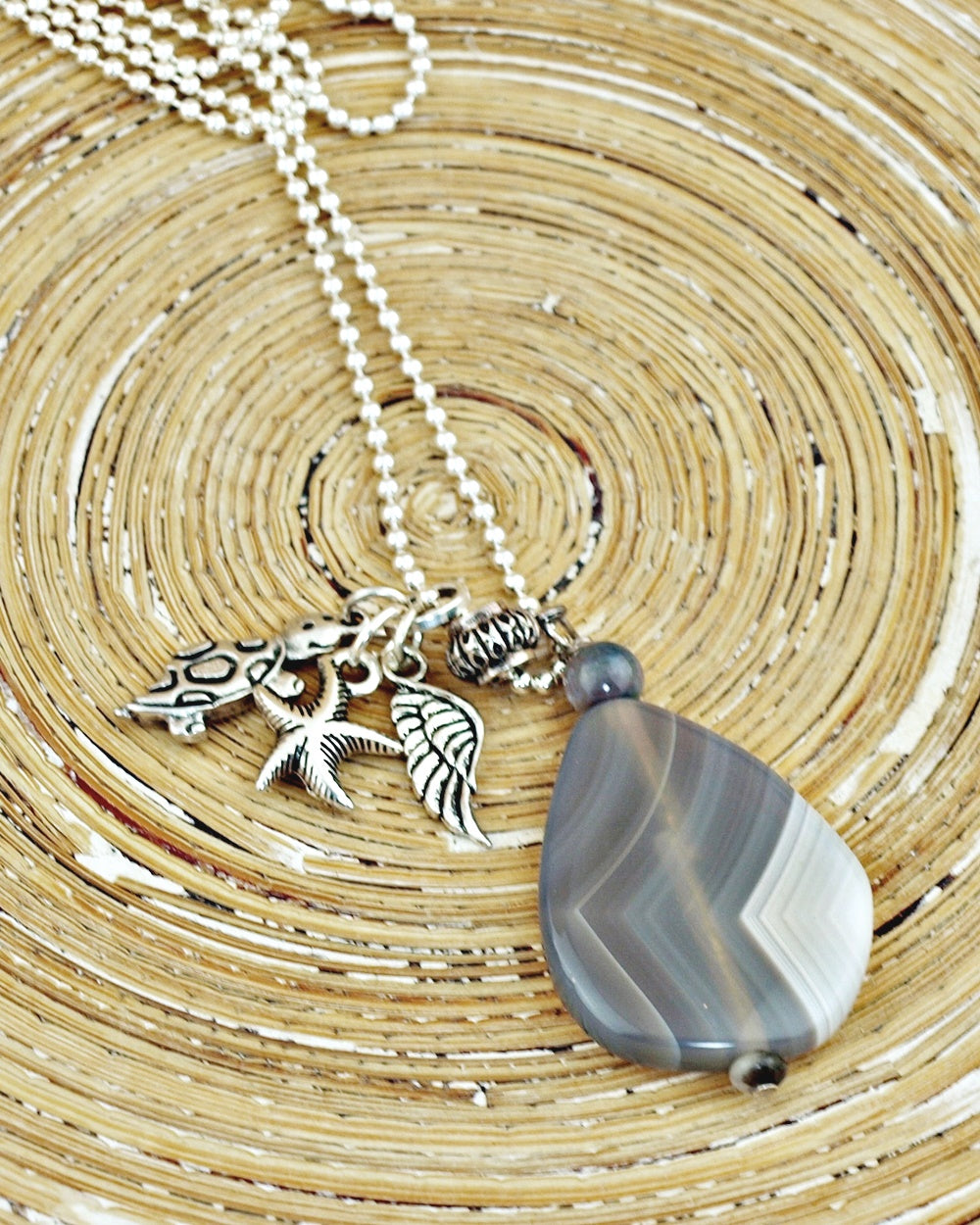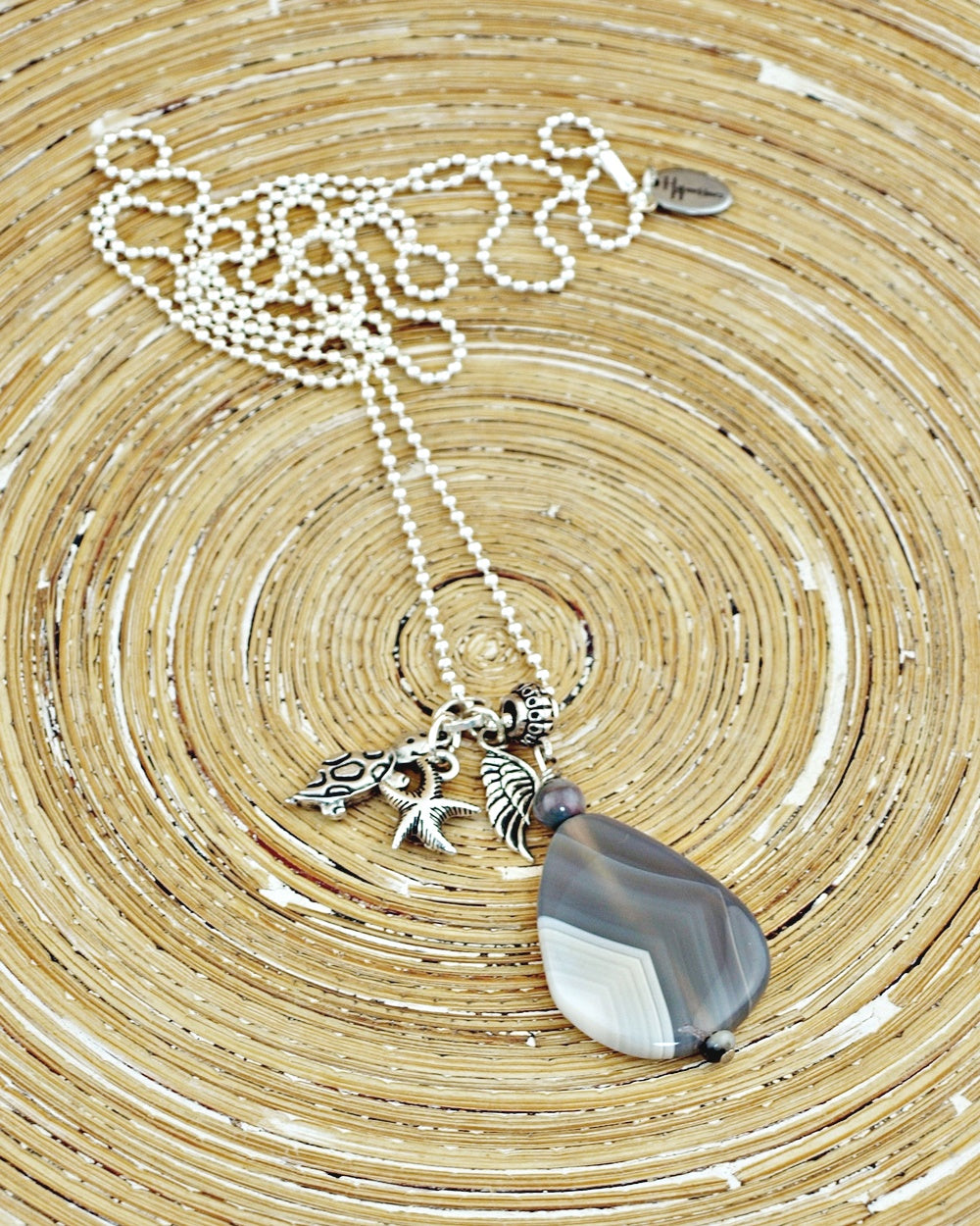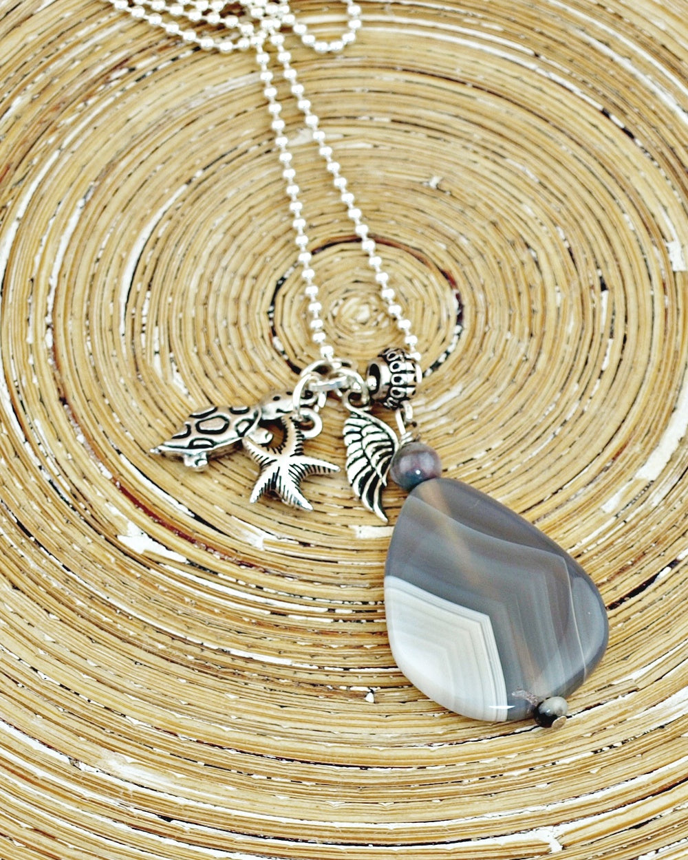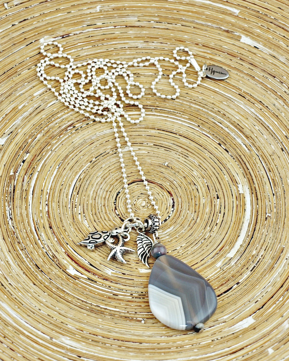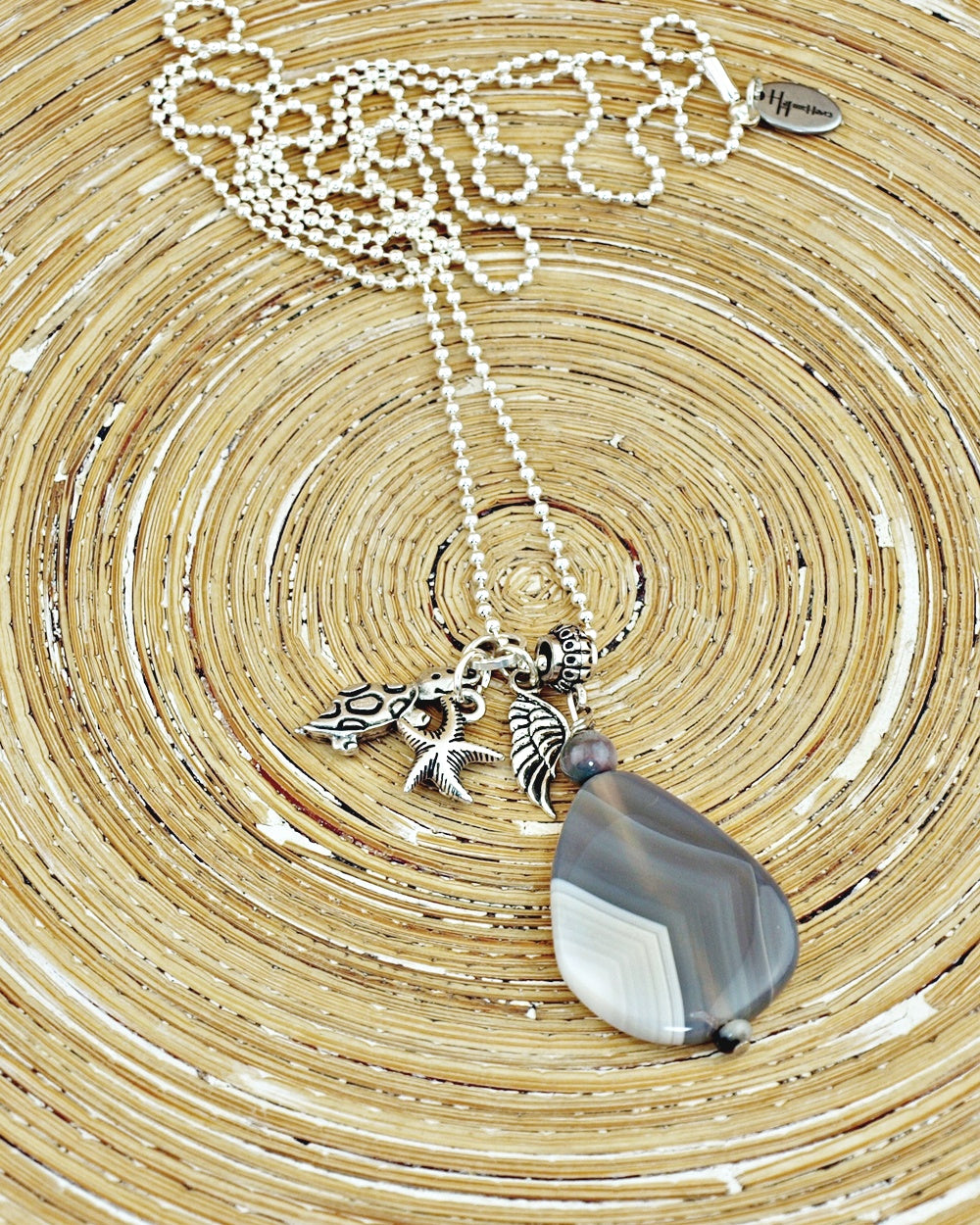 Uit de collectie Piedra Grande (grote steen) deze mooie Agaat steen die uniek geaderd is in verschillende grijs tinten. Daarnaast hangen zilveren bedels van een zeester, schildpad en een vleugel.