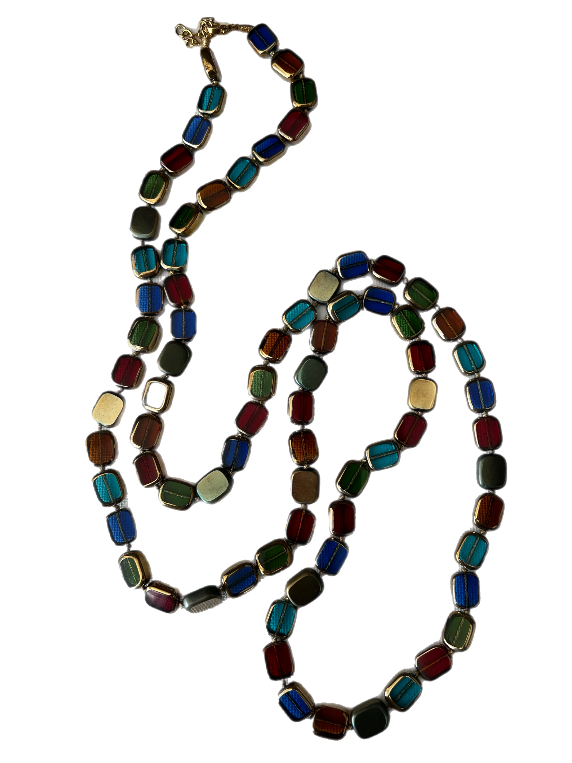 Deze prachtige ketting van rechthoekige glaskralen in een mooie combinatie verschillende kleuren en goud, is een echte eyecatcher. Met een royale lengte van 100 cm kun je hem op verschillende manieren dragen: enkel of dubbel. Dit sieraad is een exclusief exemplaar uit de HanneHaves Friends Brand Wings Bijoux een collectie van limited edition sieraden. Een perfecte toevoeging aan je sieradencollectie voor een stijlvolle herfstlook. Verwen jezelf met deze unieke ketting van HanneHaves.