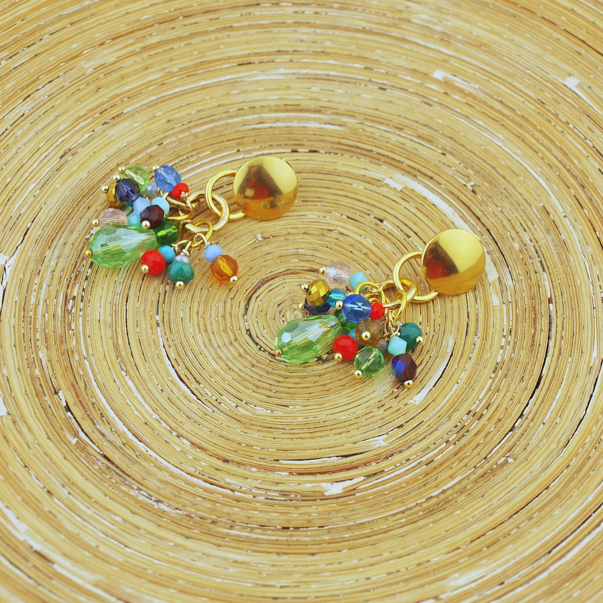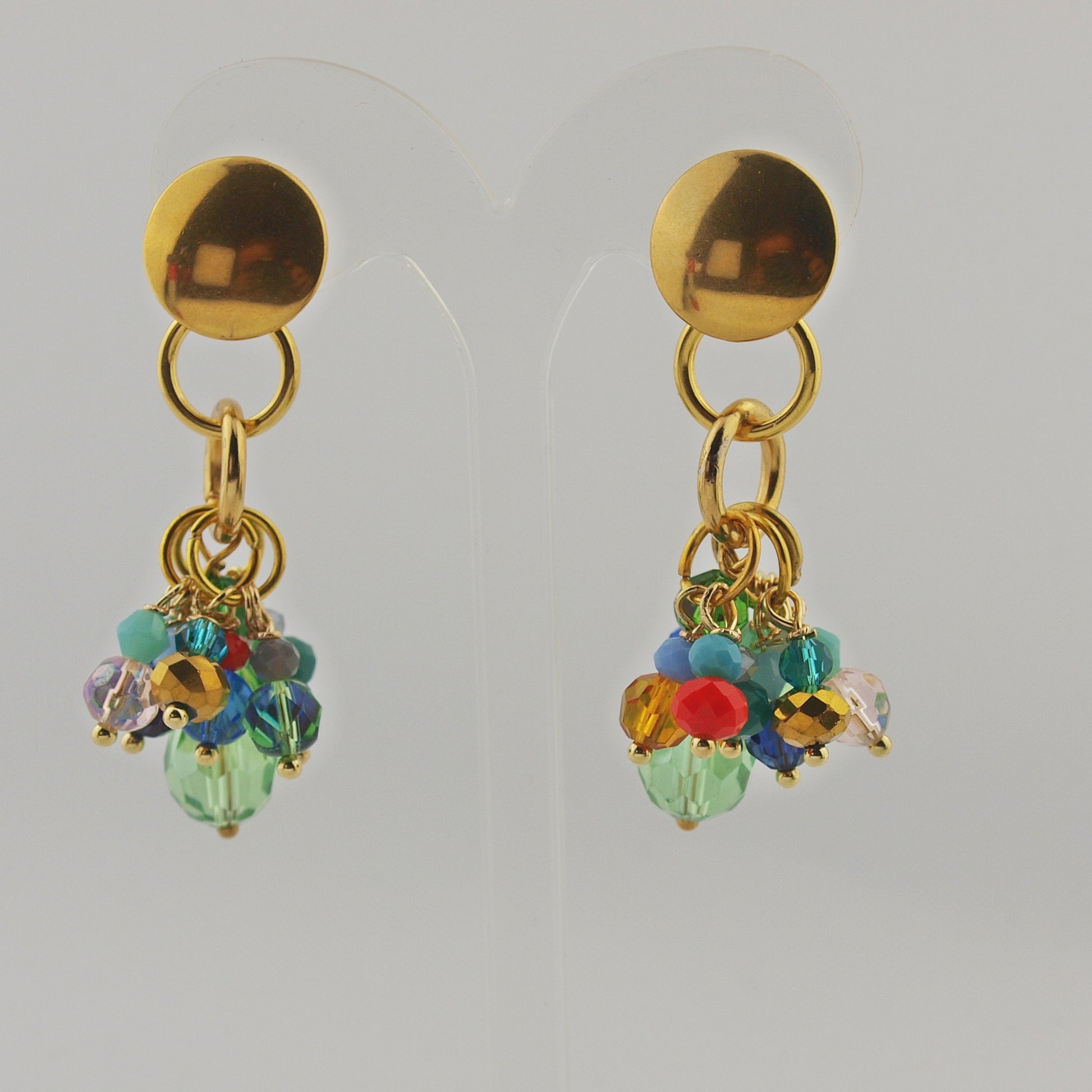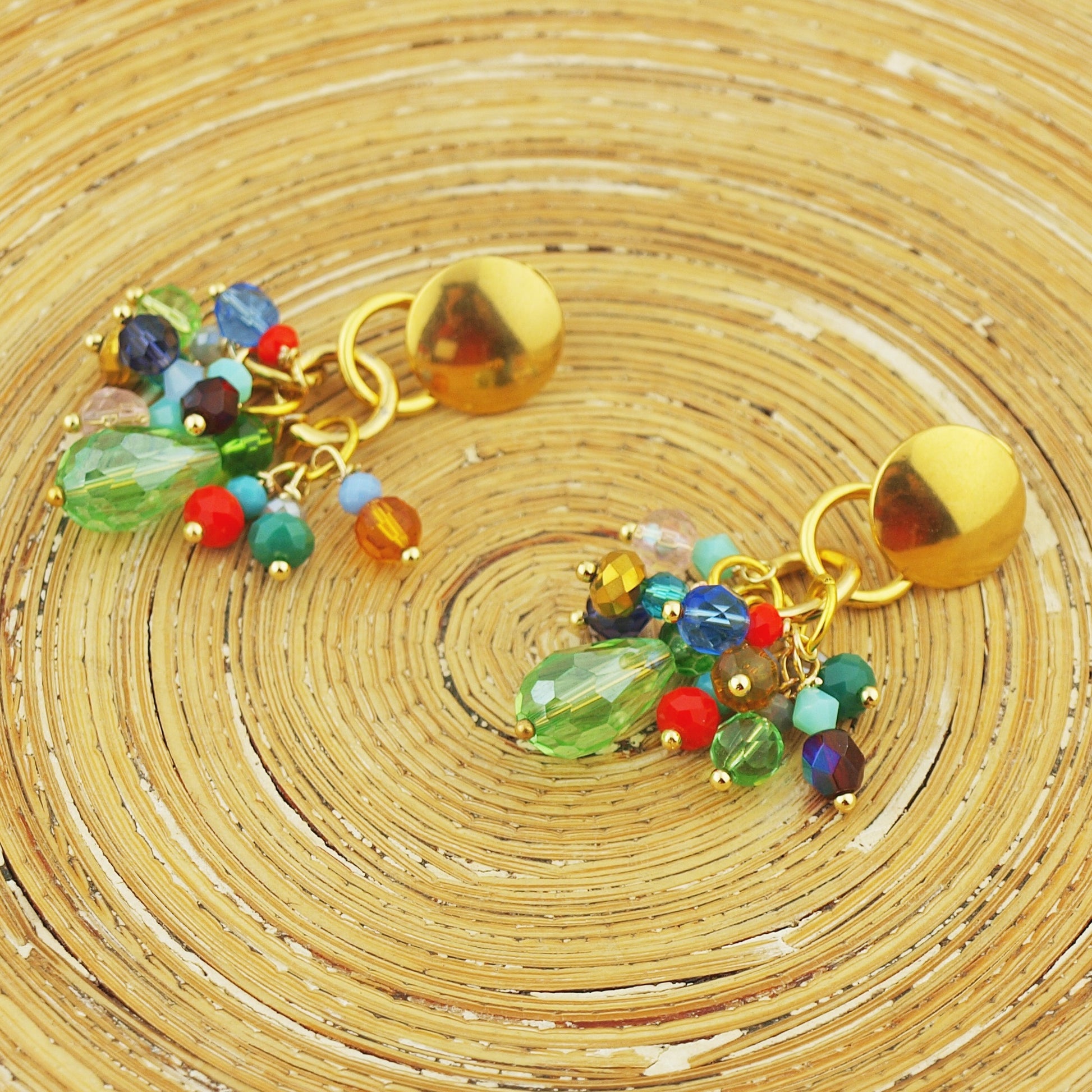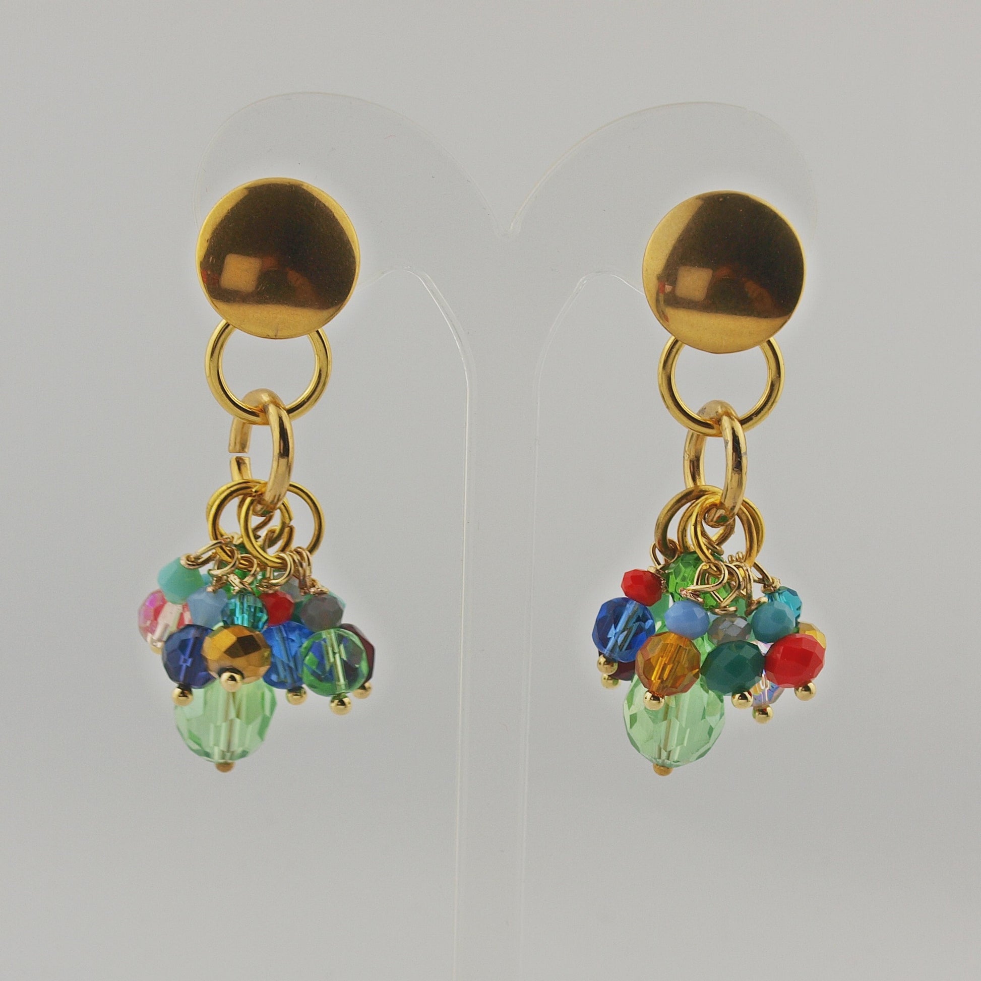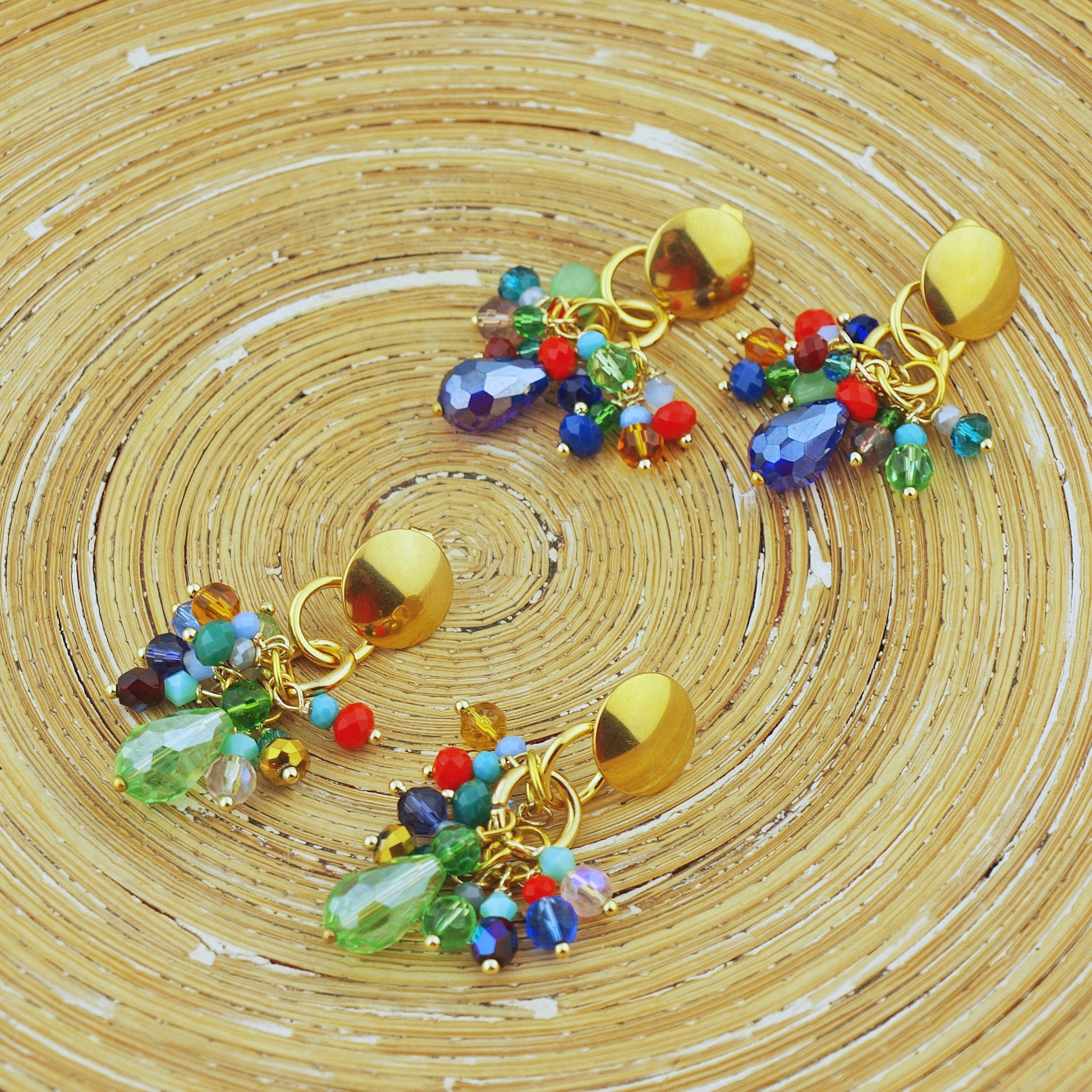 Alle kleuren van de regenboog in deze bundle oorbellen met een grote facet steen waaromheen een trosje van verschillende kralen is gevormd. Vrolijk oorbellen die dansend in je oren. Beetje bohemien en beetje bling.