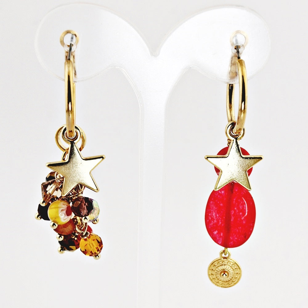 Asymmetrische oorbellen creolen zijn het perfecte accessoire om je look af te maken. Ze zijn een beetje hippie, uniek, in bohemien, style waardoor je de blikvanger van de dag bent. Met diverse kleuren, materialen en stijlen is er altijd een perfect paar asymmetrische oorbellen creolen voor jou. Ze staan prachtig bij een casual of een feestelijke outfit en zijn ideaal om je look een speciale touch te geven. Asymmetrische oorbellen creolen zijn een must-have voor elke fashionista. In de oorbellen zijn verschillende kleuren glaskralen en bedels verwerkt. De één lang met een grote steen, aan de ander een trosje kraaltjes.