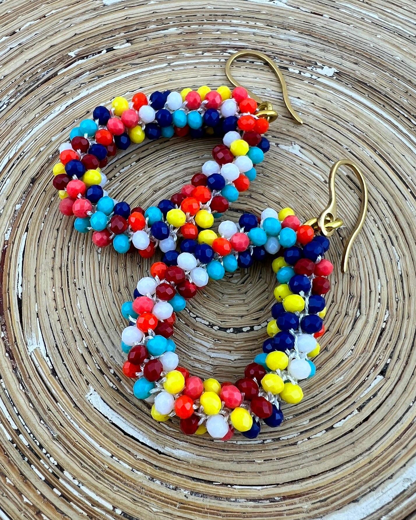 Echte statement oorbellen. Deze mooie regenboog oorbellen gemaakt van heel veel kleine kraaltjes. Vrolijke oorbellen gemaakt van een ronde hanger met heel veel kleine geweven kraaltjes. Lekker kleurrijk en daarom eindeloos combineren. Mooi bij een simpele blouse of trui maar ook heel goed om te combineren met juiste uitgesproken prints en en bohemian stijl.